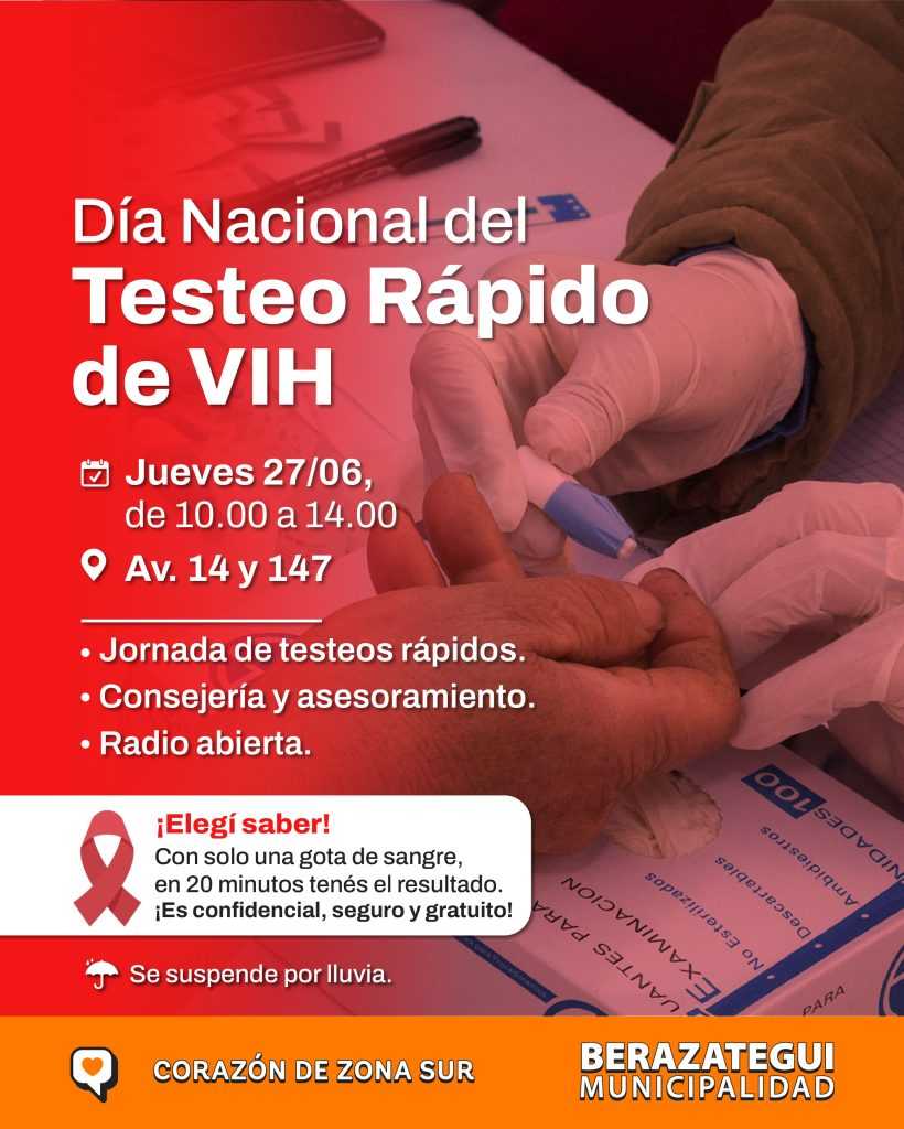 Como cada año, la Municipalidad de Berazategui realizará una jornada de concientización por el Día Nacional del Testeo Rápido de VIH. En esta oportunidad, será el jueves 27 de junio, de 10.00 a 14.00, en la Av. 14 y 147. Ese día, los vecinos y vecinas podrán realizarse testeos de manera voluntaria, confidencial y gratuita. Se suspenderá en caso de malas condiciones climáticas.