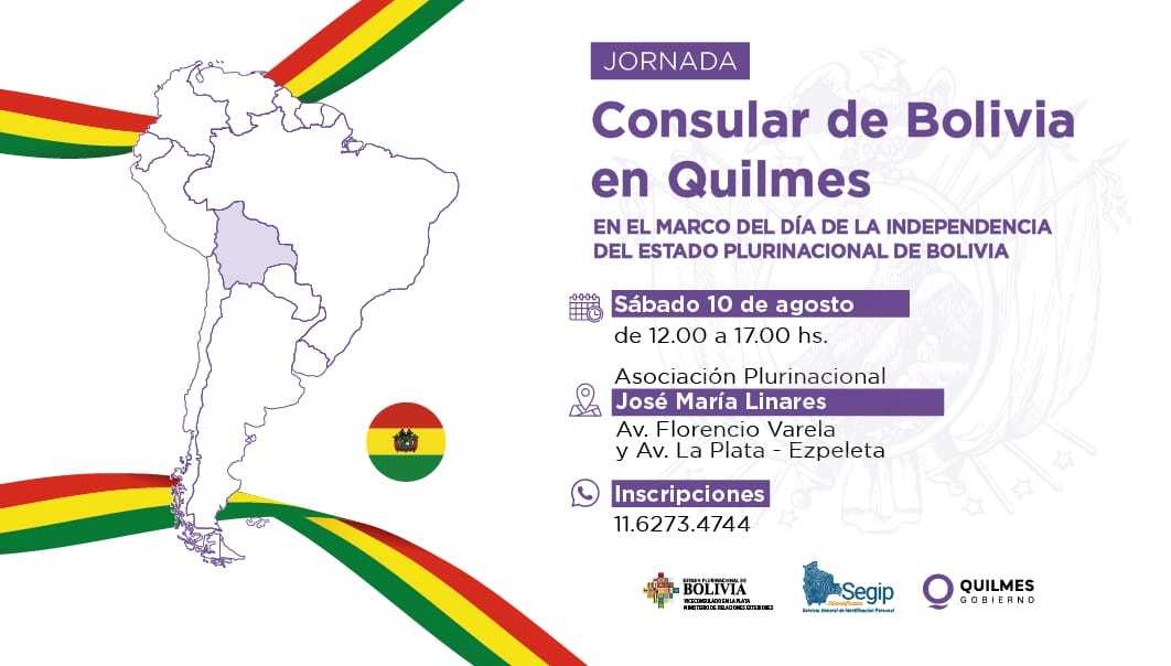 La jornada es organizada en el marco de la celebración del Día de la Independencia de Bolivia. Durante la misma la Dirección de Migrantes ofrecerá la atención personalizada en trámites de radicación, asesoramiento jubilatorio, consultas, entre otros. Por su parte el Viceconsulado de Bolivia en La Plata y SEGIP llevarán a cabo la tramitación de la renovación de cédula de identidad, antecedentes penales, certificados de nacimiento, matrimonio y defunción, y doble nacionalidad a menores de 12 años.