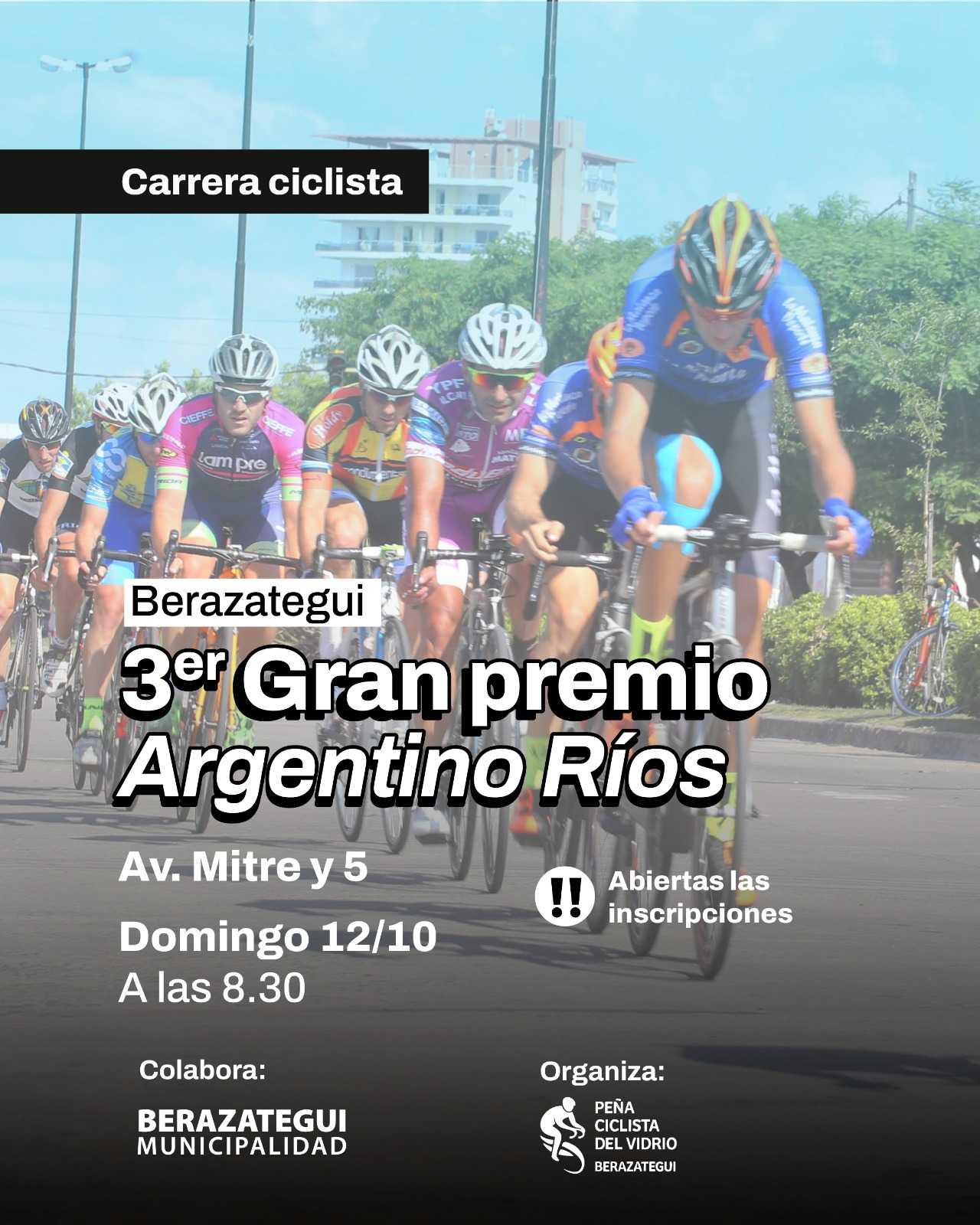 El domingo 12 de octubre, Berazategui será sede del 3er Gran Premio Argentino Ríos, una histórica carrera en circuito callejero organizada por la Peña Ciclista del Vidrio, en articulación con la Municipalidad de Berazategui y con impulso del intendente Juan José Mussi. El punto de encuentro será en Avenida Mitre y calle 5, a partir de las 8.30. Y la competencia se extenderá a lo largo de Av. Mitre entre Av. Varela y la Plazoleta de los Autonomistas (calle 7).